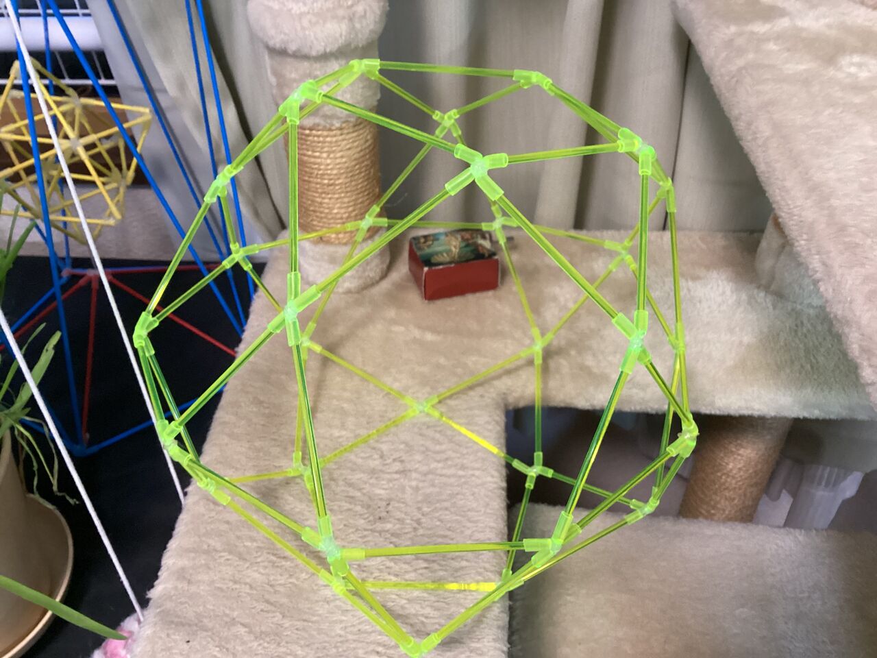 この緑の大きく歪んだフラクタル線分20・12面体に、さらに60本の線分を加えて、12面の正五角形を正五角錐の底辺にしてみる。